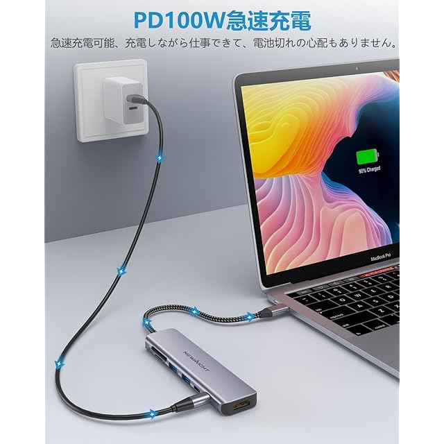 【USB C 100W 高速充電】:Power Delivery対応したUSB-Cポート経由で、MacBookやIpad pro 、 Dell XPS、Lenovo Yoga、Surface Go、HP Spectre、などパソコンに100Wの急速充電を提供できるだけではなく、安定した接続をできます。多数のデバイスを同時に接続しても、電力不足の心配がありません。