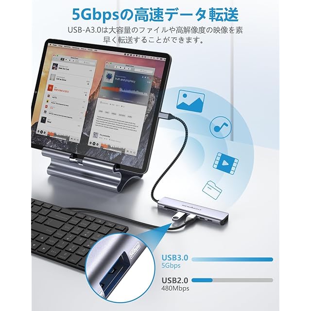 【数秒でファイルを転送】:USB-Cハブは、キーボード、マウス、メモリなどの複数のUSB周辺機器を接続するために、1つのUSB C 3.0 データ転送ポート、2つのUSB 3.0ポートを増設されます。最大5Gbpsの速度で、映画などのファイルを超高速で簡単に転送します。