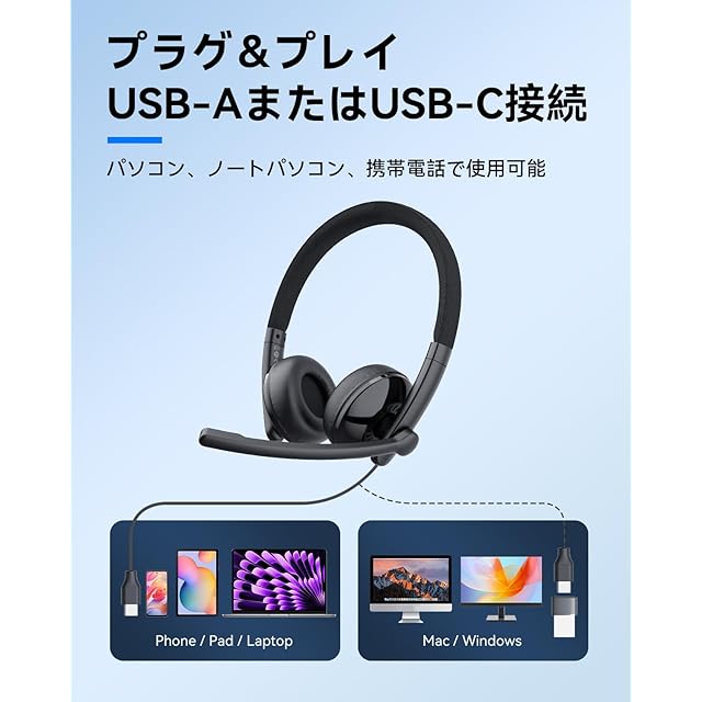 【幅広い互換性】このヘッドセットはUSB-A/USB-Cポートを搭載して、ソフトウェアをインストールすることなく使用できます。PC/タブレット/Mac/iOS/ノートパソコン/Android携帯などのデバイスに対応します。