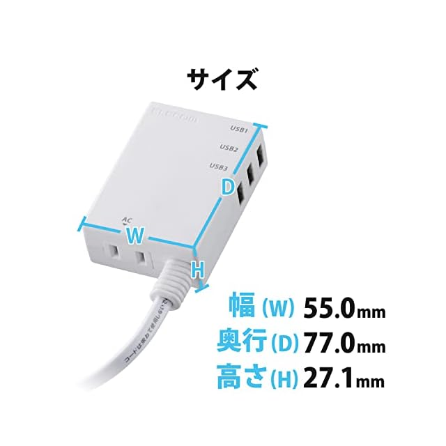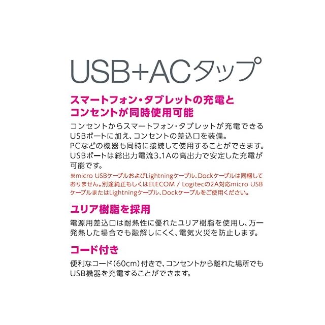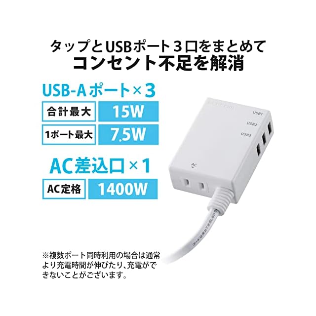 商品名:エレコム USBタップ/USBメス×3/AC×1/60cm/3.1A/ホワイト
