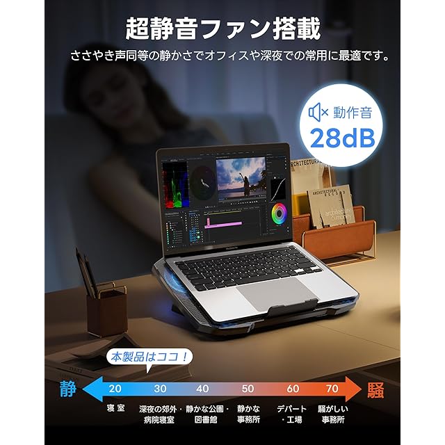 【驚異の静音性とマルチタスク機能】改良されたファンデザインとモーターにより、動作音はわずか28dB(ささやき声レベル)を実現します。深夜のオフィスや集中作業中でも、その存在をほとんど意識しません。付属のスマートフォンスタンドで、PCとスマホの同時監視も可能な利便性の高い設計です。
