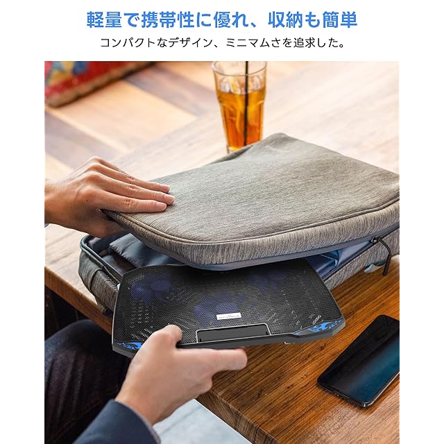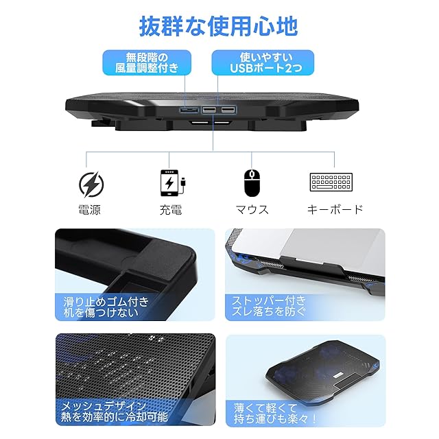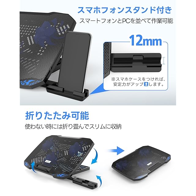 商品名:『KEYNICE 強力冷却ファン』ノートパソコン冷却パッド 冷却台 3つの大口径冷却ファン搭載 5段階高度調整可 無段階風量調節可 スマホンスタンド付き ノートPCクーラー USB給電 LEDライト 2つUSBポート 静音 滑り止め付 15.6インチ以内のノートPC/Macbook/Macbook Pro/PS3/PS4等に対応 オフィス/在宅勤務/出張用 ブラック