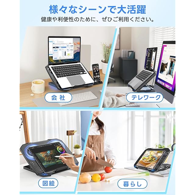 【5段階角度調整で作業が快適】人間工学に基づいた5段階の高さ調整機能を備えて、視界の高さを合わせ、理想のタイピング姿勢を保つことで、長時間の作業でも首や肩への負担を大幅に軽減します。滑り止めゴムパッドがPCをしっかり固定し、どの角度でも安定性を確保します。
