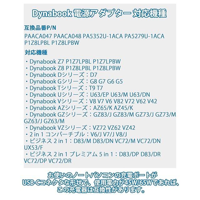 【Dynabook用 パソコン充電器タイプcの対応機種】Dynabook Z7 Z8 D7 G8 G7 G6 G5 T9 T7 U63/EP U63/M U63/DN V8 V7 V6 V82 V83 V72 V62 V42 Z65/K AZ45/K GZ83/J GZ83/M GZ73/J GZ73/M GZ63/J GZ63/M VZ72 VZ62 VZ42 V6/J V7/J V8/J D83/M D83/DN VC72/M VC72/DN UX53/F D83/DP D83/DR VC72/DP VC72/DRなどDynabook Type-C パソコン。ARROWS Tab シリーズ:EH WQ2/E2 WQ2/E1,LIFEBOOK シリーズ:WU3/F1 WUB/F1 WU-X/E3 WU2/E3 UH95/E2,UH90/E2 WU3/E2 WU2/E2 UH-X/D2 UH95/D2 UH90/D2 UH75/D2 WU3/D2 WU2/D2 WU-X/F3 WU2/F3 WUB/F3などType-C パソコンにも対応可能です。