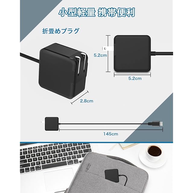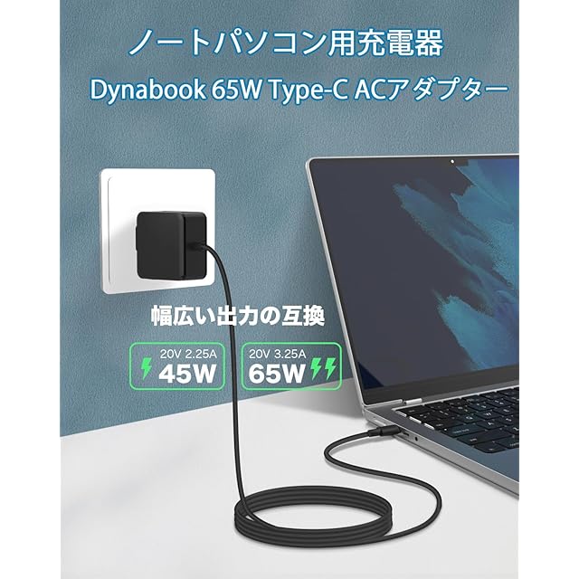 【電源アダプターの商品規格】交換・代替 dynabookと互換性のある65W acアダプター Type-C となっております。入力:100-240V 50-60Hz 1.5A; 出力65W: 5V 3A, 9V 3A, 12V 3A, 15V 3A, 20V 2.25A, 20V 3.25A, PPS: 3.3-21V/3A;これPD対応の45W/65W タイプc充電器を備え、dynabook ノートパソコンからタブレット端末、スマートフォンまで幅広い機器に急速充電できます。せっかく重量の軽いノートパソコンを購入しても、ACアダプターが重ければ持ち歩く際に苦労します。会社や学校などに純正のACアダプターを置いておき、自宅に65W USB -C 急速充電器 を置いておけば、わざわざ重いACアダプターを毎日持ち運ぶ必要がありません。