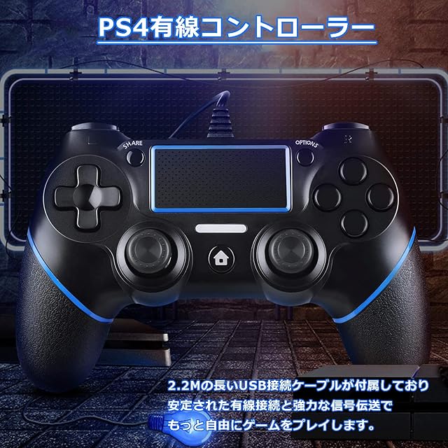 商品名:P4 コントローラー 有線 プレステ4 ゲームパッド USB接続 システム対応 人間工学 二重振動 重力感応 機能搭載 高耐久ボタン プレステ4 Pro/Slim P3 Win7/8/10対応 日本語説明書付き