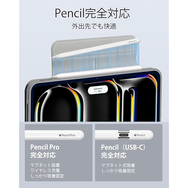 【Pencil Pro&Pencil (USB-C)対応】:Pencil Proへ完全対応かつ、磁気充電用の側面の溝と、Pencilをしっかりと固定するマグネットクラスプを備えています