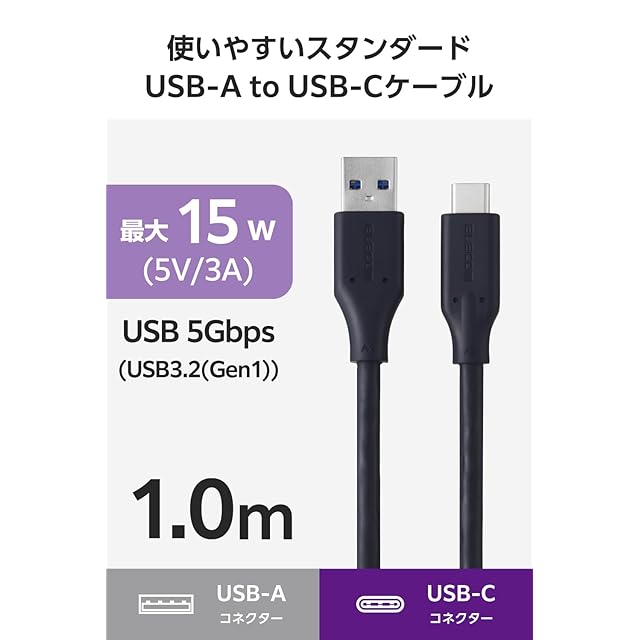 商品名:エレコム usb c ケーブル 1m Type-C to USB-A USB3.2 急速充電 5Gbps 15W 【iPhone/Xperia/Galaxy/iPad/MacBook などに対応】 ブラック MPA-ACEC5G10BK