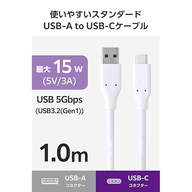 商品名:エレコム usb c ケーブル 1m Type-C to USB-A USB3.2 急速充電 5Gbps 15W 【iPhone/Xperia/Galaxy/iPad/MacBook などに対応】 ホワイト MPA-ACEC5G10WH