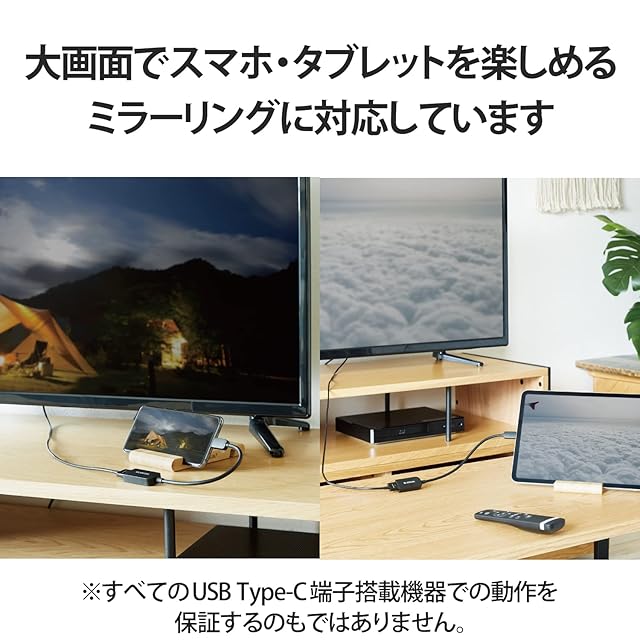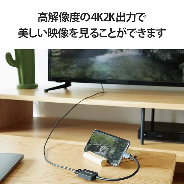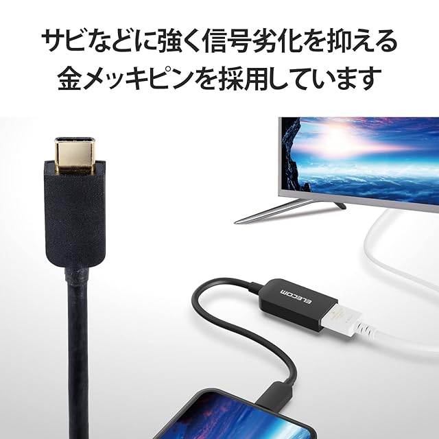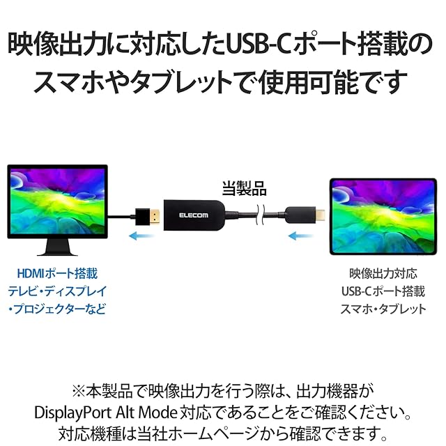 USB Type-C(TM)端子から映像出力可能なパソコン、スマホ、タブレットなどに接続することで、HDMI入力端子を搭載したディスプレイなどに映像出力が可能なUSB Type-C(TM)映像変換アダプターです。※HDMIからUSB Type-C(TM)への変換はできません。※音声出力に対応しています。※映像が正しく表示されない場合は、接続先のディスプレイの電源ON/OFFや各接続コネクターの抜き挿しをお試し下さい。※環境、機器により正常に動作しない場合があります。※すべての機器での動作をするものではありません。※本製品で映像出力を行う際は、出力機器がDisplayPort Alt Mode対応であることをご確認ください。※NINTENDO SWITCH(TM)には対応しておりません。