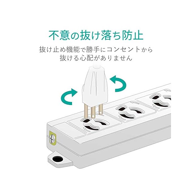 差し込み口を回転させることによりプラグをロックすることができ、不意の抜け落ちを防止します。