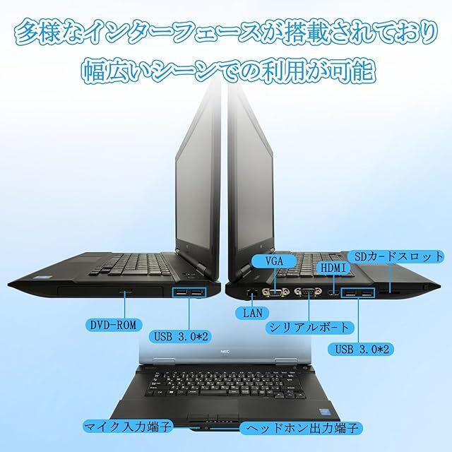 【充実したインターフェースで幅広く活躍】 HDMI/VGAで外部モニター接続可能、SDカードスロットで写真取り込みも簡単。DVD-ROMも搭載しており、古い資料の閲覧やCD再生にも対応。WiFiと有線LAN両対応で、安定した通信環境も実現します。プレゼンや家庭用、学習用にも多用途に対応します。