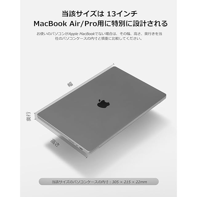 【対応機種】内寸:305 x 215 x 22mm。13-13.6インチ MacBook Air 2025-2018 (モデル:M4/A3240 M3/A3113 M2/A2681 M1/A2337 A2179 A1932) | 13インチ MacBook Pro 2023-2016 (モデル:M2/A2686 M1/A2338 A2251 A2289 A2159 A1989 A1706 A1708)にピッタリ対応。13インチ iPad Pro M4 / 13インチ iPad Air M3 M2 / 12.9 iPad Pro 6/5/4/3世代 にカバー無 | 12.3-13インチ Surface Pro 11 Copilot+ PC/10/9/8 | HP Pavilion Aero 13 | NEC LAVIE N13 Slim / SOL | 富士通 FMV UHシリーズ 2018年から | Dynabook GA/ZYにも対応。