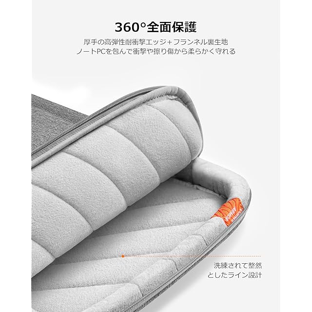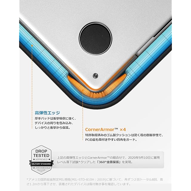 【軍用規格の360°全面保護】特許取得の「CornerArmor 」ゴム製クッション はケースの4角に内蔵し、超強衝撃吸収力でエアバッグのようにパソコンを意外落下などから全方面保護。ジッパー周りの耐衝撃性に優れた高弾性パッドと厚みのあるふわふわしたフランネル裏生地で、ノートPCを衝撃や擦り傷からしっかり守ります。2020年にアメリカ軍用落下試験(規格MIL-STD-810H:2019)をクリア。