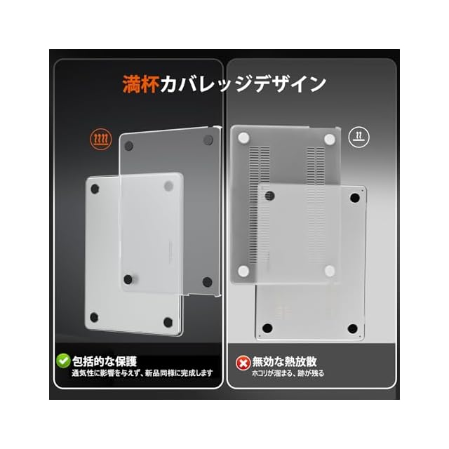 ハードケースの特徴: 高品質プラスチック製のMacBook Air15 M4 ケースで、日常の擦り傷や傷からMacBookを保護。超薄型軽量設計で重量増加を防ぎ、高い衝撃強度と温度耐性により、ケースの変形を防ぎます。底面の4つのゴム足と通気孔が放熱をサポート