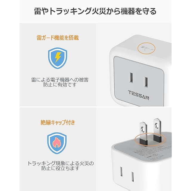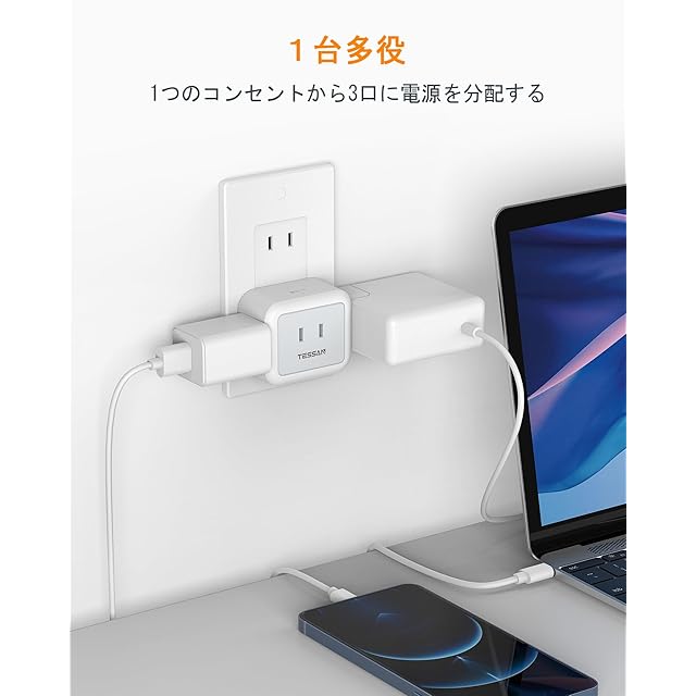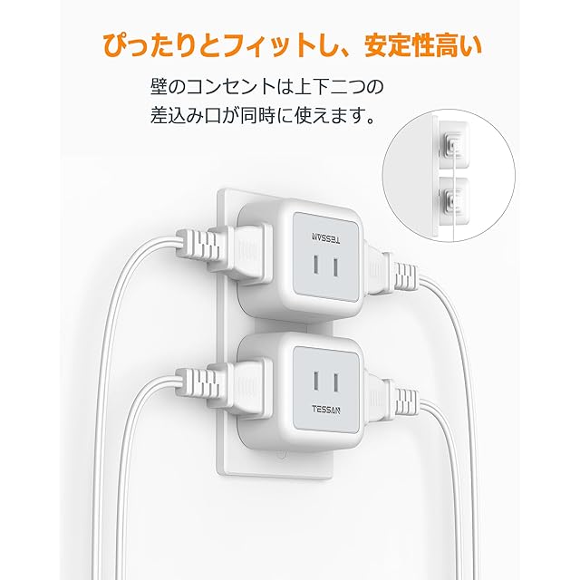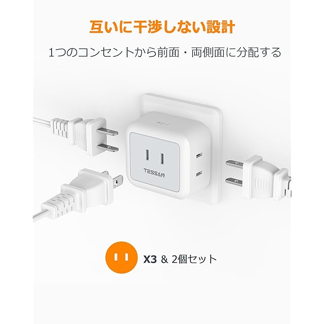 【互いに干渉しない蛸足コンセント】TESSANの電源式コンセントは違った方向に分岐していて、プラグ同士が邪魔にならない、大きな充電器を差しても隣の差込口に干渉しません。電源プラグが中央に配置されていないデザインで、小型であり、壁のコンセントは上下二つの差込み口が同時に使えます。