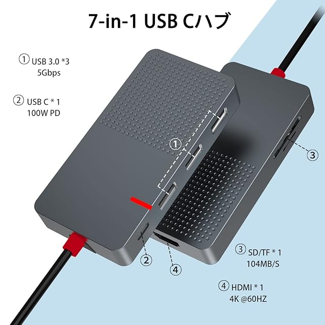7-in-1 USB Cアダプタ:USB Cドッキングにより、限定されたノートブックPCポートを7つのマルチポートに拡張4K@30HzHDMI出力ポート、100 W PD充電、SD/TF 3.0カードリーダー、3つのUSB-A 3.0とUSB-C 3.0データポートは、お客様の多様なニーズに対応します。ソフトウェアやドライバを必要としないプラグアンドプレイ。ハブをプライマリデバイスに接続し、添付ファイルをポートに接続することをお勧めします