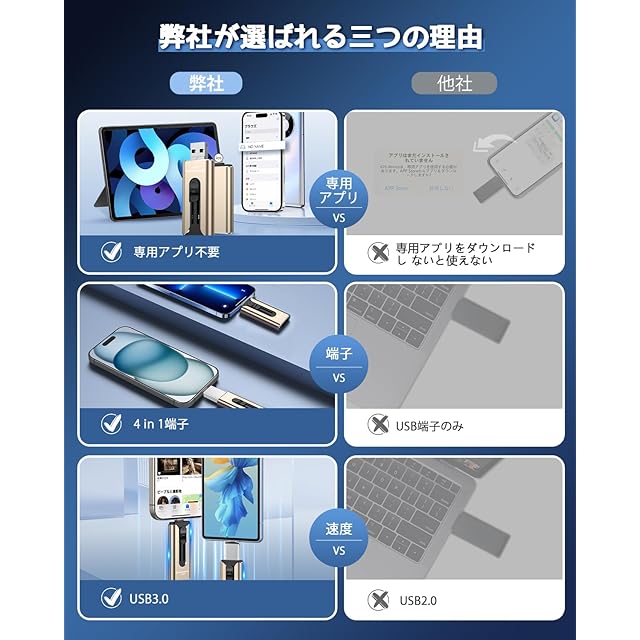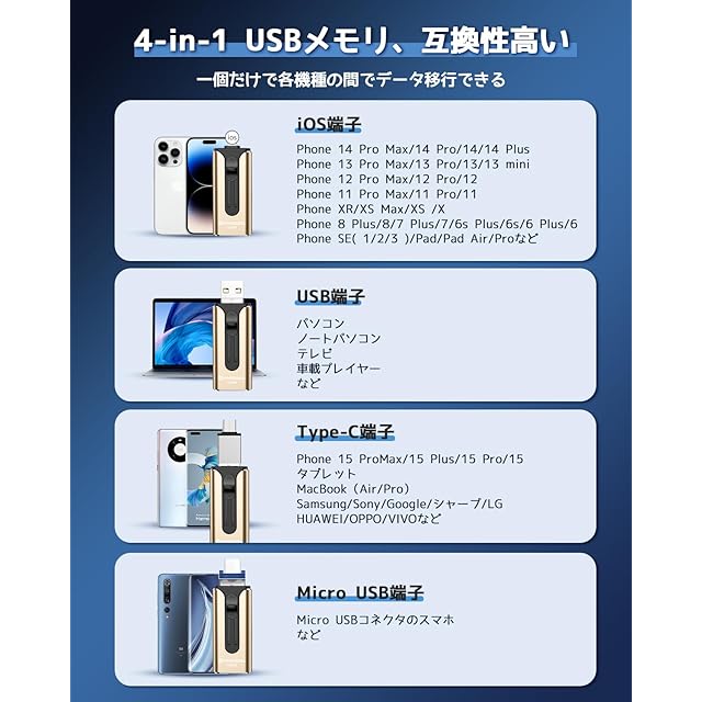 【4in1・多機能usbメモリー】USBメモリはiOS、Type-C、USB、Micro USBの四つのコネクタを搭載し、Phone、Pad、パソコンからテレビやプリンターまで、ほとんどの機種と互換性があります。USBメモリは、スマホ容量不足解消しながら、データ保存の機能も果たして、データ移行、データ管理、ファイル移動、データ共有やファイル圧縮などの機能も搭載されます。