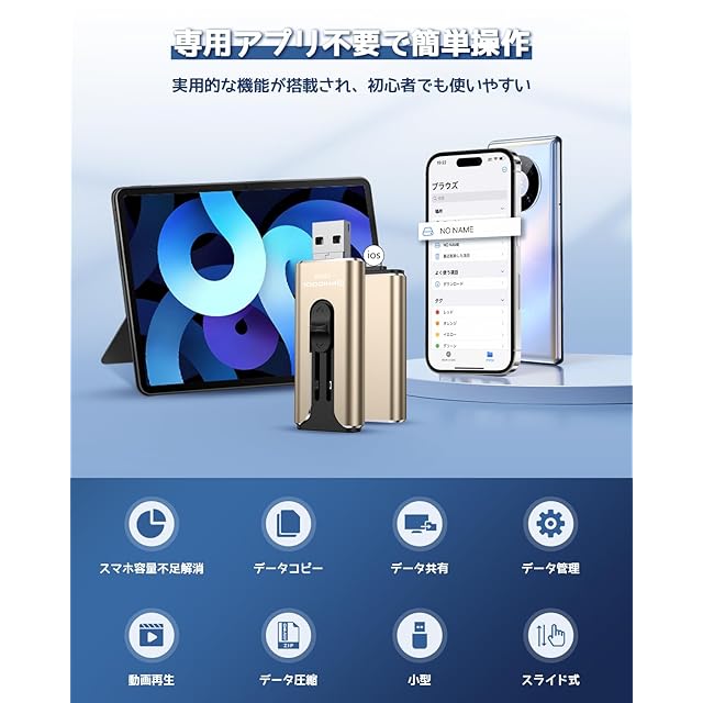【アプリが必要なく、操作は簡単になり】まだアプリをダウンロードすることに困っていますか。今はスマホにUSBメモリをを挿入するだけで、パソコンを起動せず、専用アプリも使用せずに、スマホのデータをバックアップできます。電子機器が得意でない方も簡単に操作出来て、他の外付けストレージと比べて、多機能のUSBメモリは画期的です。