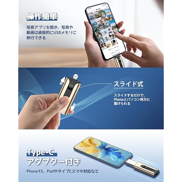 【専用アプリ不要 データ移行簡単】Phone対応 USBメモリ128GB 4in1 phone データ保存 iOS/Type-C/USB/Micro usb搭載 phone 写真バックアップライド式 タイプc usbメモリ phone 外付けストレージ Phone/Pad/PC/Macbook/Android対応 携帯容量不足解消 ゴールド