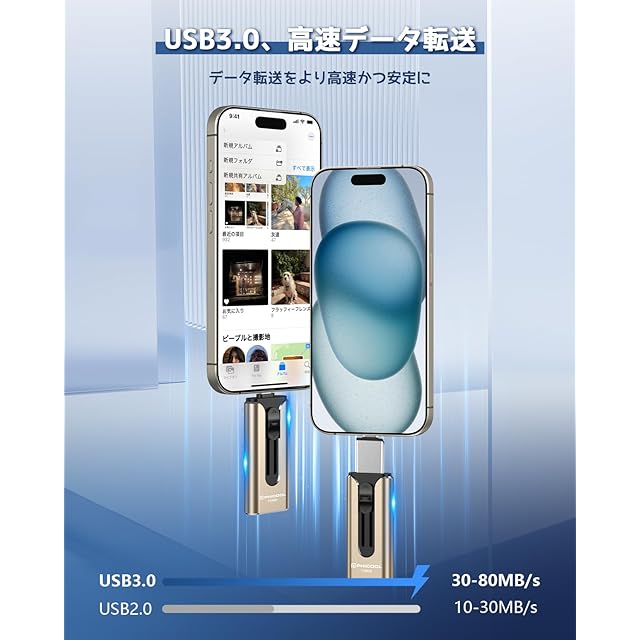 【スマホ容量不足解消・多場合に対応】スマホに保存されている動画、写真やダウンロードされているアプリが多ければ多いほど、スマホの容量はいっぱいになり、それ以上データを保存できなくなります。今はスマホのデータをクリーンアップする必要はなくて、USBメモリをそっと挿入するだけで、スマホ内のデータをUSBメモリに移して保存できます。これにより、スマホの空き容量を増やして、iCloudに課金する必要もなくなります。。USBメモリーは、日常生活で家族や友達などの写真を保存したり、仕事で各種資料を保存したり、旅行先で撮影した写真や動画を保存したり、飛行機でUSBメモリーを使って動画を視聴したりと、様々な使用シーンがあります。