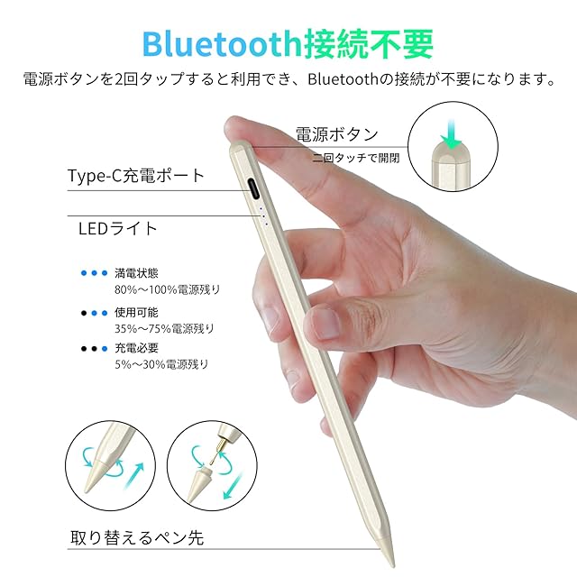 【2018年以降のiPad専用タッチペン】対応機種:iPad (第6/7/8/9/10世代)、iPad Pro 12.9” (第3/4/5/6世代) 、iPad Pro 11”(第1/2/3/4世代) 、iPad Air (第3/4/5世代) 、iPad mini (第5/6世代)。(iPadモデルをiOS13.1以降に更新する必要があります。)