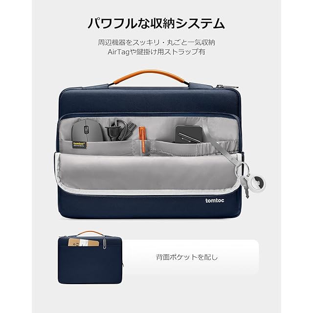 【パワフルで一目瞭然の収納システム】コンパクトでながら3室。大きなフロントポケットに複数なポケットとAirTagや鍵掛用ストラップを配し、アダプタ・ケーブル・ハブ・iPad Air/Proなどをスッキリ収納・整理できます。背面にもポケットがあり、書類やICカードなどよく出し入れのモノを収納できます。