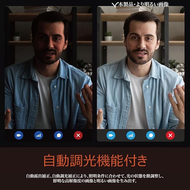 「自動調光補正 より明るい画像 」逆光対応しているため、過大露光や露出不足など高コントラストで撮影した画像を自動で補正して、明度差のある場面でもくっきりとして映像を記録します。また、本製品V11の自動露出補正、自動調光補正により、照明条件に合わせて、光の状態を微調整し、鮮明な高解像度の画像と明るい画像を生み出します。どのような環境下でも最適な露出を自動で調整できるウェブカメラになります。