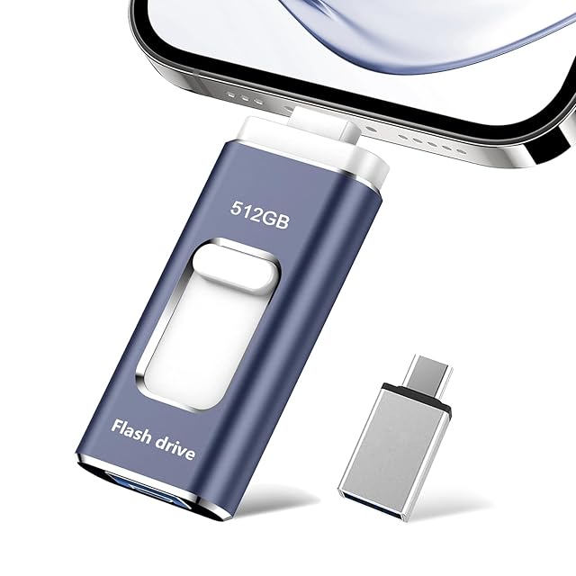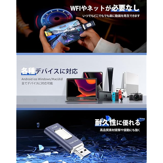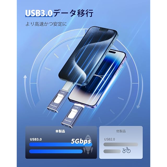 512GB USBメモリー【アプリ不要】4in1 iphone対応usbメモリ高速USB 3.0 IOS/USB/Type-C/micro usb フラッシュメモリ type-c USB メモリーphoneデータ 転送保存 写真 バックアップアイフォン用 外付けメモリ 携帯容量不足解消(ネイビーブルー)