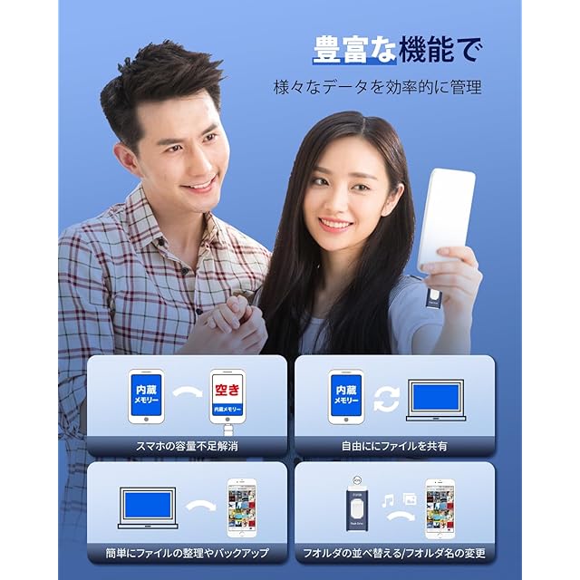 【簡単データ管理・容量不足解消】 phone用外付けメモリシンプルで使いやすいデザインと、初心者でも簡単に操作できます。プラグアンドプレイの機能で、手間がかからず、スムーズなデータ移行が可能です。写真、ビデオ、音楽、ドキュメントなどのファイルを効率的に整理し、管理することができます。データの整理とバックアップを一括で行い、ストレスを軽減しましょう。スマホ/タブレットに容量不足をすぐに解決できます。PCいらずでも空き容量を確保できます。