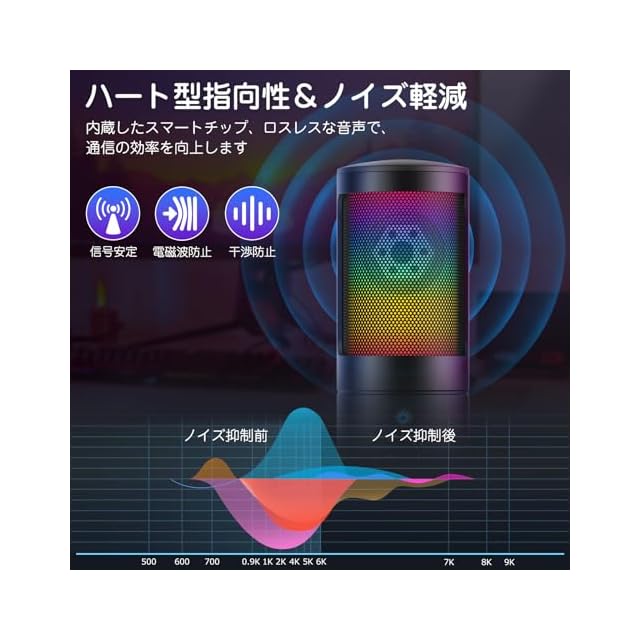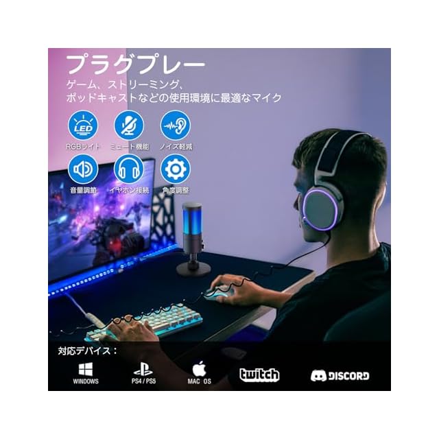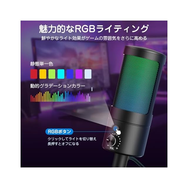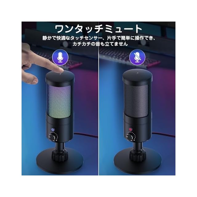 ♫【超魅力的なRGBライト&ワンタッチミュート】 A30マイクには複数の静態単一色と多色の自動グラデーションRGBイルミネーションが内蔵されており、さまざまなスタイルの場合にマッチングことができます。柔らかくで名を引くのRGBライティングは、ビデオやライブ配信で画面を活躍し、ゲーミングセットアップと調和のとれた色効果を生み出します。また、押しボタンの代わりに、マイク上部のタッチセンサーがあり、ミュート/ミュート解除を一瞬で切り替えて便利です。★ミュート機能は直感的にRGBライトで表現されます、マイクがミュートされるとRGBライトがオフになり、誤操作を低減します。