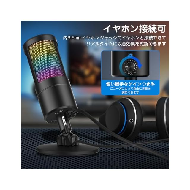 Faunow マイク USB コンデンサーマイク PC マイク RGBライト ワンタッチミュート カーディオイド指向 プラグ&プレイ ヘッドホン接続可 音量調節 内蔵型ショックアブソーバー 超コンパクト ボイズチャット YouTube ライブ配信 web会議 ゲーム実況に最適 Windows/MacOS/PS4/PS5など対応【A30 スタンド式】 (black) | つむぎ屋