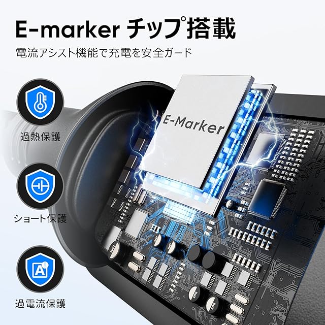 【E-markerチップ搭載】E-markerスマートチップ搭載により、5A大電流への対応と三重安全防御を実現:過充電を0.1秒単位の電圧監視でブロックし、短絡をマイクロ秒級電流制御で遮断、発熱は基板内蔵サーミスターによる85℃超防止で抑制。これらを統合的に作用させることで高安定性の急速充電をします。