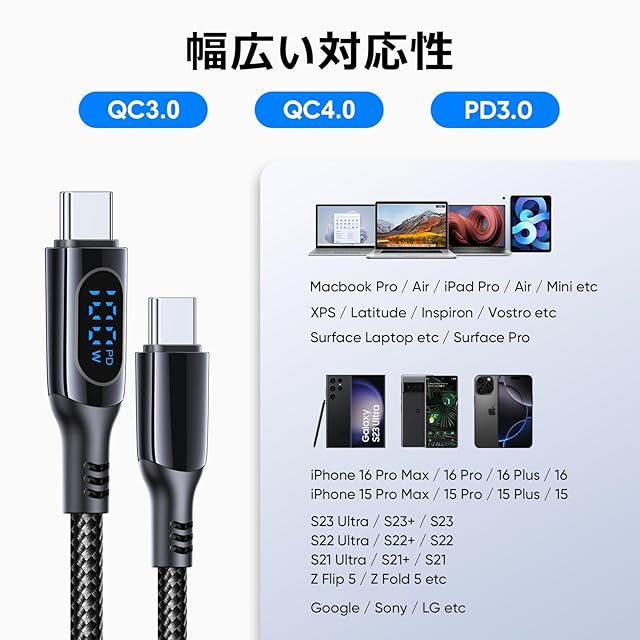 【PDで最大100W充電を実現】最大100Wの超高速充電を実現するUSB PD対応ケーブル。20V/5Aの高出力でスマホ・タブレット・ノートPCの充電時間を大幅に短縮。PD3.0規格により5V/3A(15W)から20V/5A(140W)まで自動調整し、多段階急速充電を秒速で切替。充電器と機器双方がPD対応時に最適性能を発揮します。