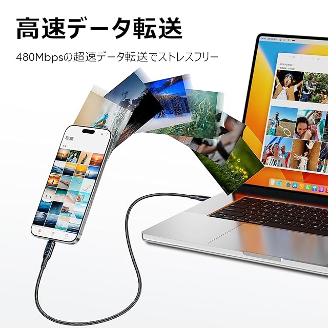 【耐久性と柔軟性を両立】高密度ナイロン編組ケーブルが優れた折り曲げ耐性を実現し、Type-C端子の強化メッキ処理による断線防止設計を融合することで、従来を上回る耐久性と柔軟性の両立を達成し、長期使用に耐える高寿命設計のType-Cケーブルです。