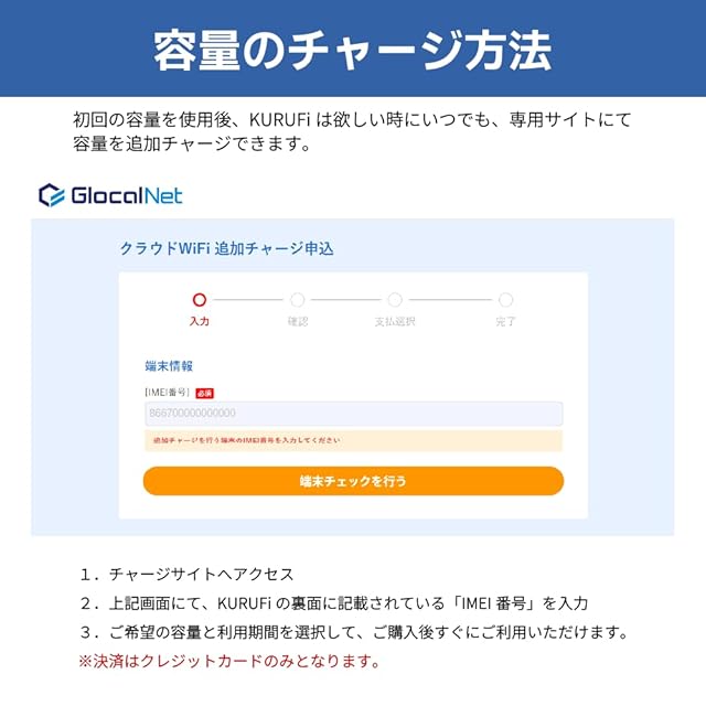【月額不要&チャージ式】面倒な契約手続き不要。初回の容量がなくなったら、専用サイト(https://order.glocalnet.jp/topup/?brand=glocalnet)で24時間いつでもチャージが可能。