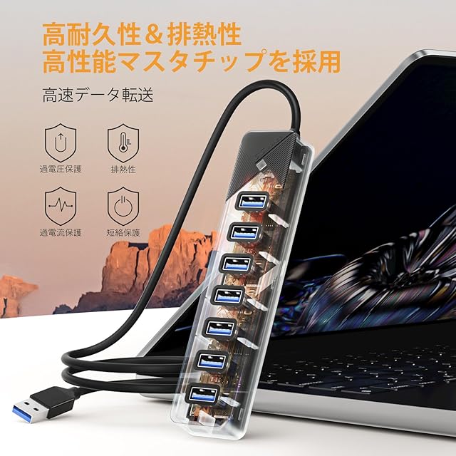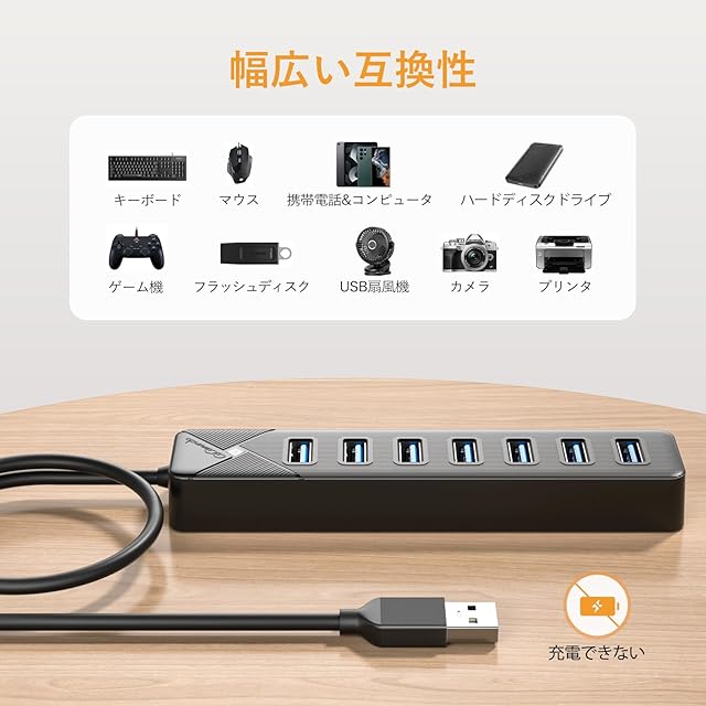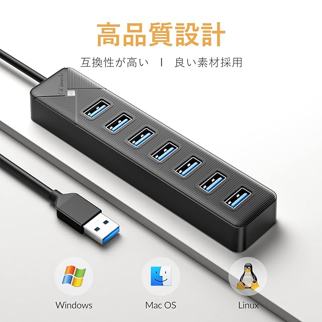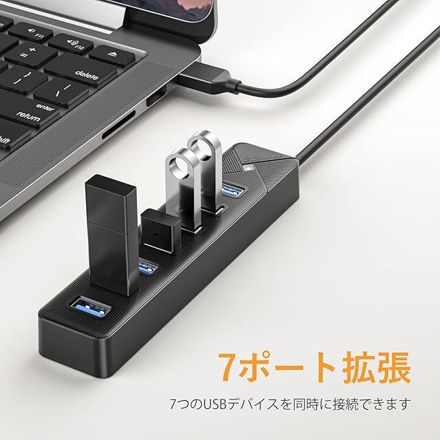 【USB 3.0 7ポート拡張】本製品はコンピュータの7台USBポートで、USBポートが足りない問題を解決します。マウスやキーボード、USBメモリや外付けHDD、プリンタなどをまとめて接続できます。