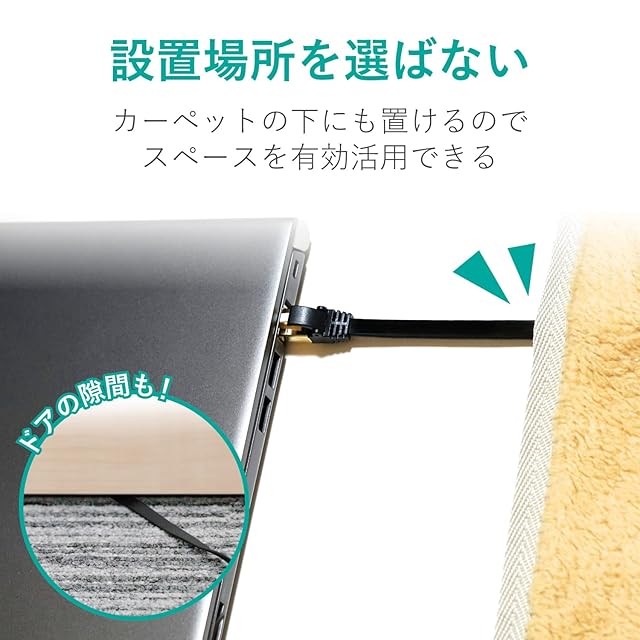 カーペットの下やドアの隙間に配線できる薄さ約2.3mm、幅約7.2mmのフラットタイプです。