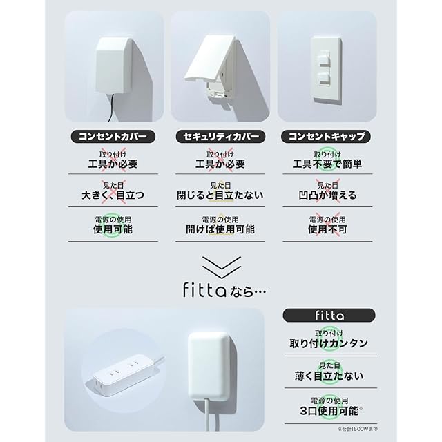【壁にとけこむ 電源タップ 】パッと取り付けて生活感をなくす!薄型コンセントカバー付き電源タップ fitta (フィッタ)。ご家庭はもちろん、オフィスや店舗などあらゆるシーンのコンセント周りをスッキリ美しく。