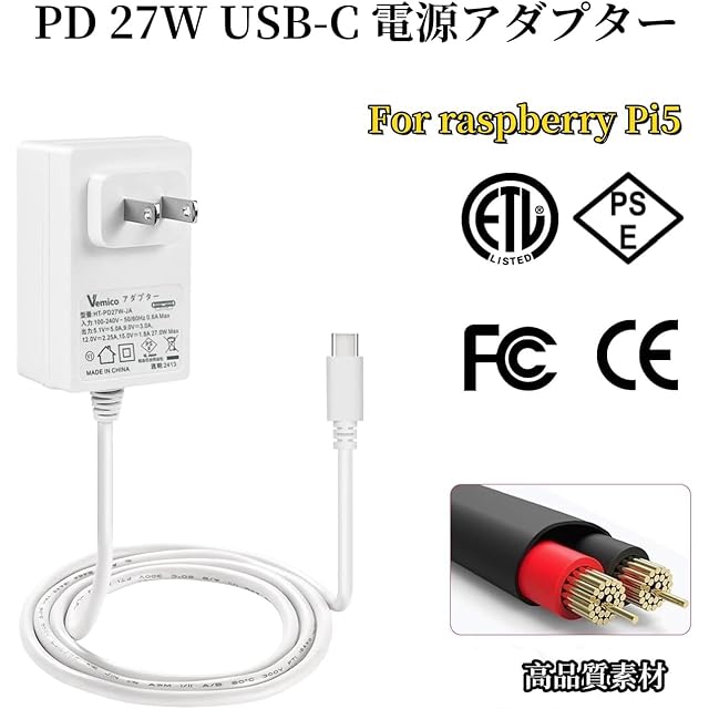 【Pi5 PD電源規格】Raspberry Pi5 PD電源アダプター:入力:AC100—240V(PD対応) 50/60Hz;出力: 5.1V/5A、9V/3A、12V/2.25A、15V/1.8A (電力供給);ケーブル長:1.2M;タイプ:PD-27W USB-C;色:白。Raspberry Pi 5に対応。Raspberry Pi 5電源は耐久性と高温耐性のある素材を使用しているので、高い充電効率と優れた放熱性を備えています。PSE認証により、先進的な電気回路と内蔵の安全装置を備えており、短絡保護、過熱保護、過負荷保護、過電流保護、過電圧保護を提供して、お使いのraspberry Piを多方面から保護します。