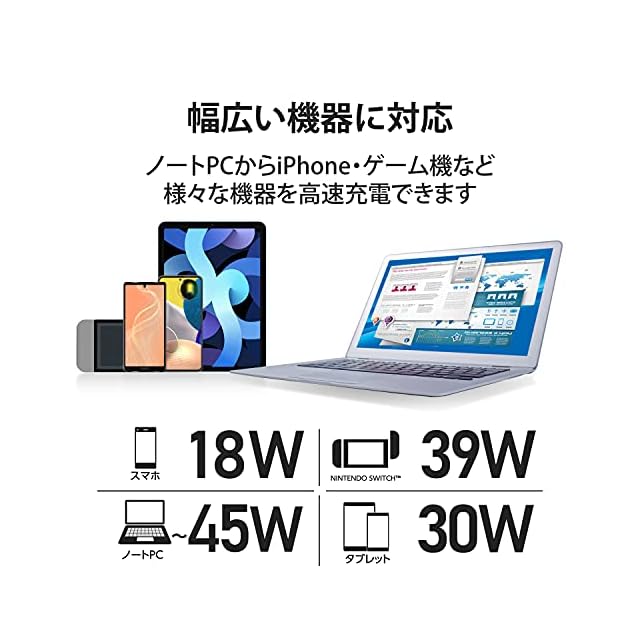 端末に応じて出力が5V/3A、9V/3A、12V/3A、15V/3A、20V/2.25Aと可変し、iPhoneなどのスマートフォンから、Nintendo Switchなどのゲーム機まで幅広く高速充電できます。※ Nintendo Switchはドックでの充電はできません。