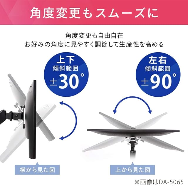 調節可能角度: 画面回転範囲:±180°、傾斜角度:+30°・-30°、アーム旋回範囲:±90°