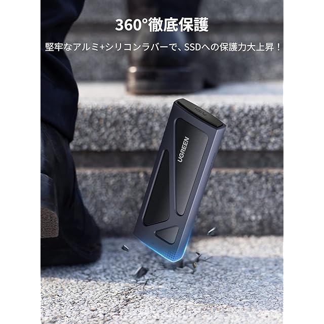 【保護性能20倍進化】堅牢性に優れたアルミ合金を採用して耐久性が期待できるM.2 SSD 外付けケースです。滑りにくいシリコンラバーもついているので、落下時縁にかかる衝撃を大幅に軽減、耐久性UP!