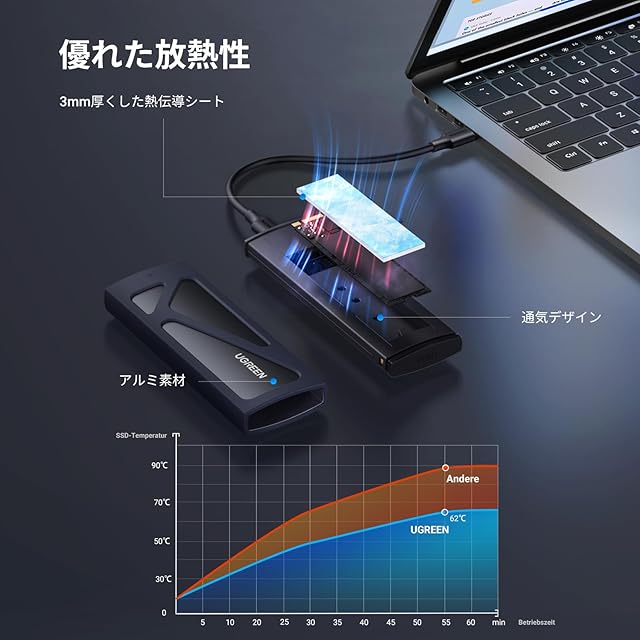 【10Gbps高速転送速度】UGREEN M.2 SSD ケースはUSB 3.2 Gen2とUASPに高速モードに対応により、10Gbpsの転送速度で高画質の写真や大容量動画データなどのコピーも高速で完了!※記載されている速度表記は規格上の理論値または弊社テスト環境での実測値です。お使いのSSDやPCの性能により変わります。