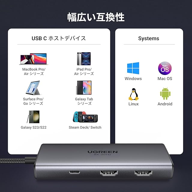商品名:UGREEN Revodok 206 6 in 1 USB Cハブ 2*HDMI出力 ドッキングステーション 4K@60Hz 単一出力8K@30Hz 100W PD急速充電 5Gbps高速データ転送 MacBook M1/M2, XPS, ThinkPad, iPad Pro/Airに対応 【USB C ポートは映像出力をサポートしていません】