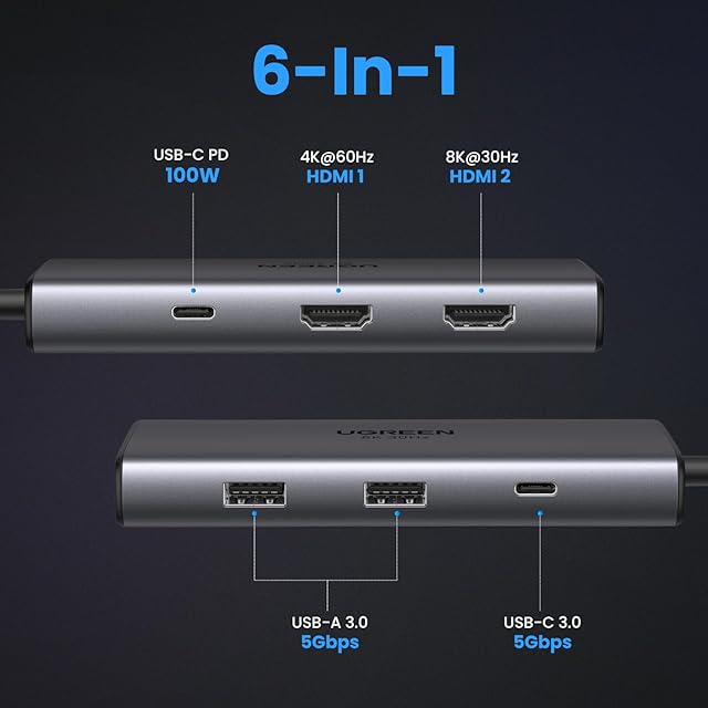 UGREEN Revodok 6 in 1 USB Cハブ ドッキングステーション 2*HDMI出力 4K@60Hz 単一出力8K@30Hz 100W PD 5Gbps高速データ転送 USB A3.0*2 USB C3.0*1 MacBook M1/M2, XPS, ThinkPad, iPad Pro/Air, Surfaceに対応