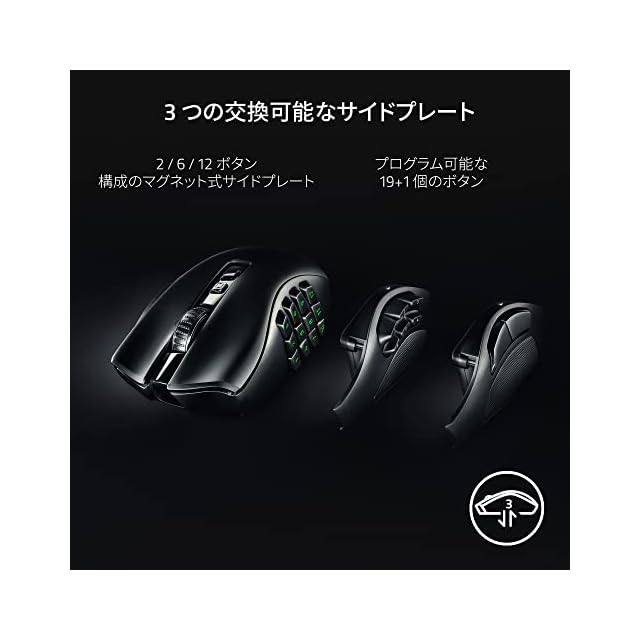 【3つの交換可能なサイドプレート】2個、6個、12個のボタン構成のマグネット式サイドプレートを備えているため、最大19+1個のプログラム可能なバックライト対応のボタンを使用してMMO、バトルロワイヤル、FPSなど様々なジャンルのゲームに対応できます。