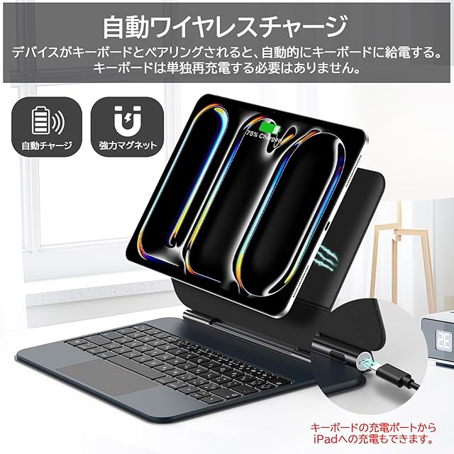 【新型自動チャージマジックキーボード】Bettdowから新しく発売されたマジックキーボードは、iPadからキーボードに電力を供給する機能を実現しました。キーボードはiPadに取り付け、Bluetoothをペアリングするだけで通常使用できます。次回使用するときはBluetoothで接続する必要がなく、ケースを開くとすぐに使用できます。キーボードの電池残量を心配なく心地よくタイピングします。