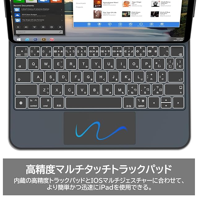 【マルチタッチトラックパッド】改良されたトラックパッドが設置されており、iPadをすばやく簡単に操作することができます。IOSマルチタッチジェスチャーに対応しているので、文書の編集、レポートの作成、ウェブの閲覧を圧倒的なスピードで行うことができできます。また、便利なショートカットを搭載しているので、ワンタップで光度レベルや音量を調整したり、音楽を変更したりすることができます。