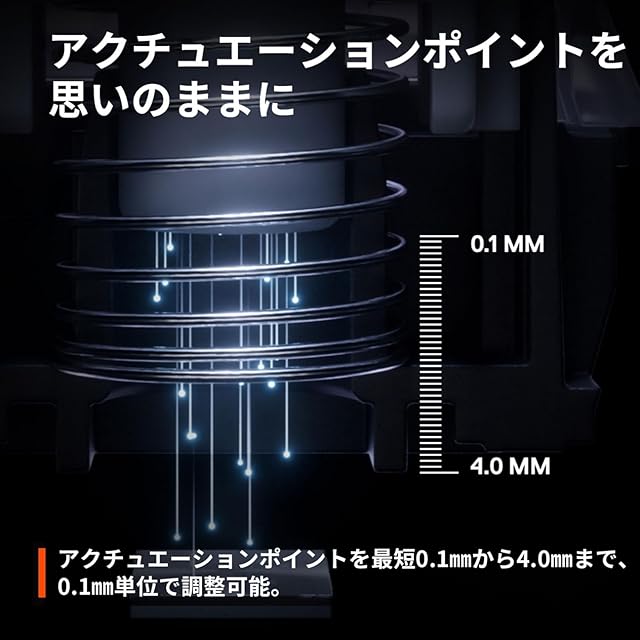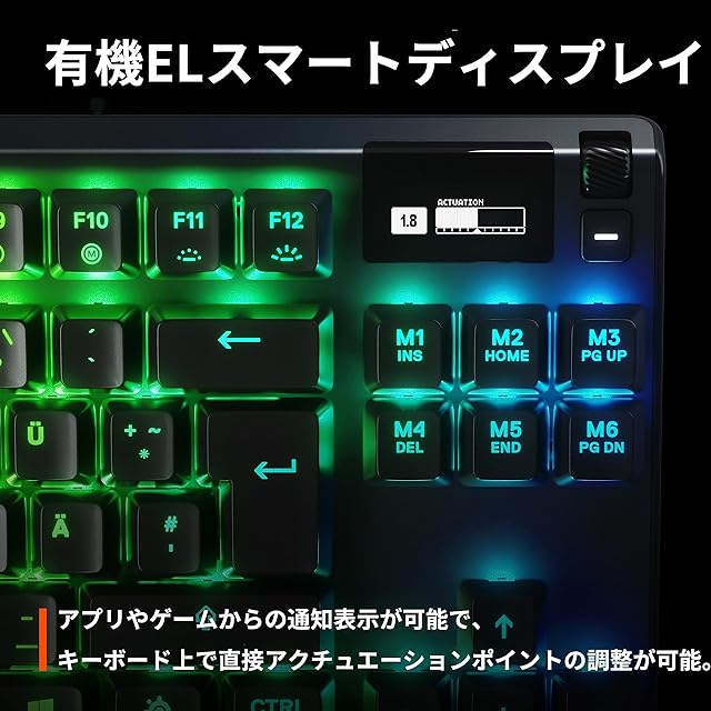 【アクチュエーションポイントを思いのままに】アクチュエーションポイントを最短0.1㎜から4.0㎜まで、0.1㎜単位で調整可能。【2-in-1アクションキー】キーの押し方に応じて、1つのキーに2つのアクションを設定することが可能。【有機ELスマートディスプレイ】アプリやゲームからの通知表示が可能で、キーボード上で直接アクチュエーションポイントの調整が可能。